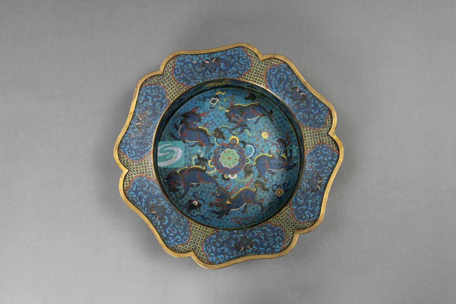 清早期掐丝珐琅瑞狮戏球纹葵瓣盆