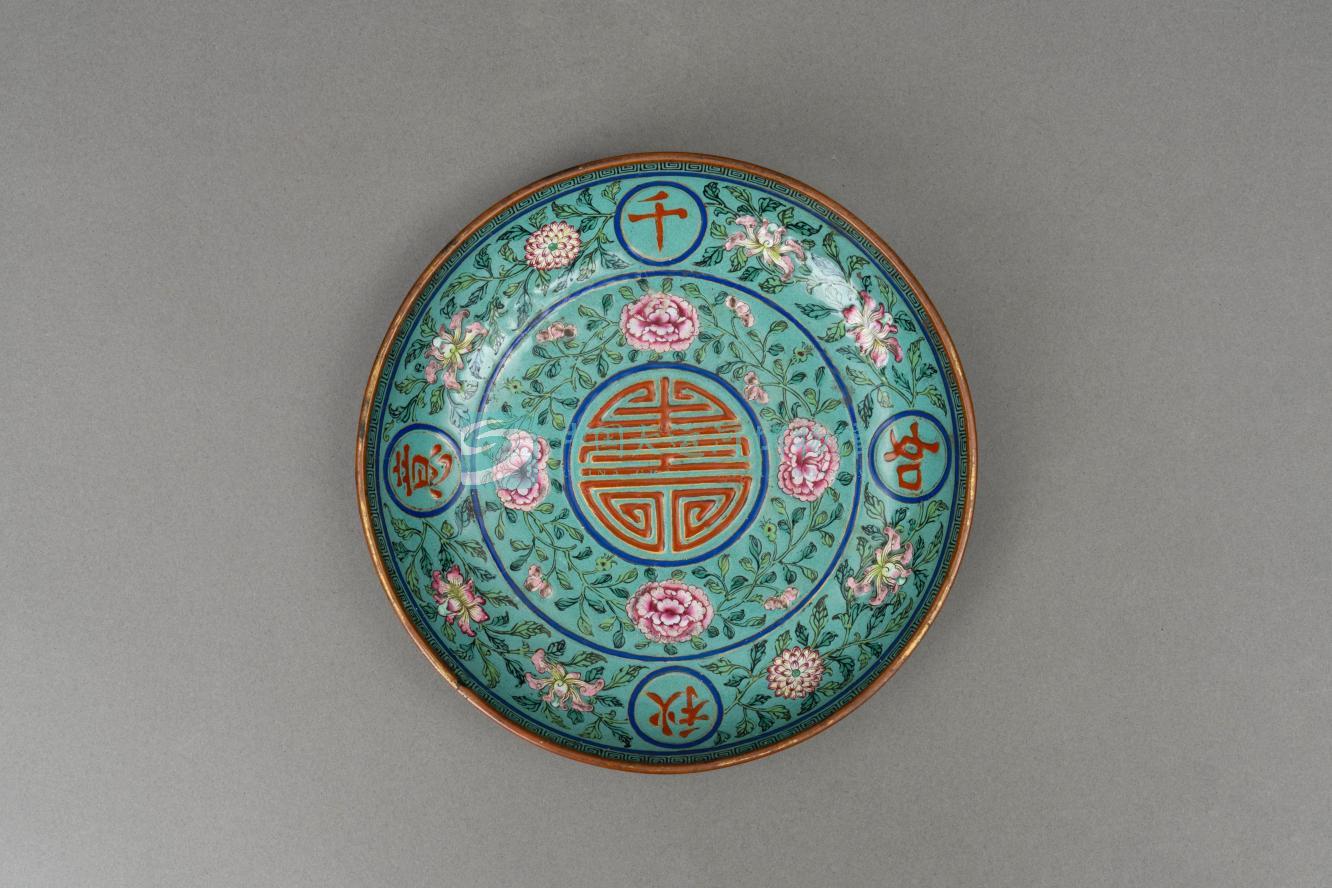 清铜胎画珐琅缠枝花托千秋如意纹盘