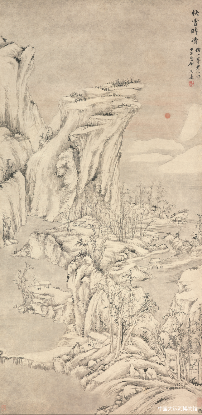 此幅仿自传为黄公望所作《快雪时晴图卷》(故宫博物院藏),以干笔皴擦来表现雪景的静谧雅洁,山石堆垒,平台矾头交错,而村墟篱落空寂,山川旷远,红日涌出。